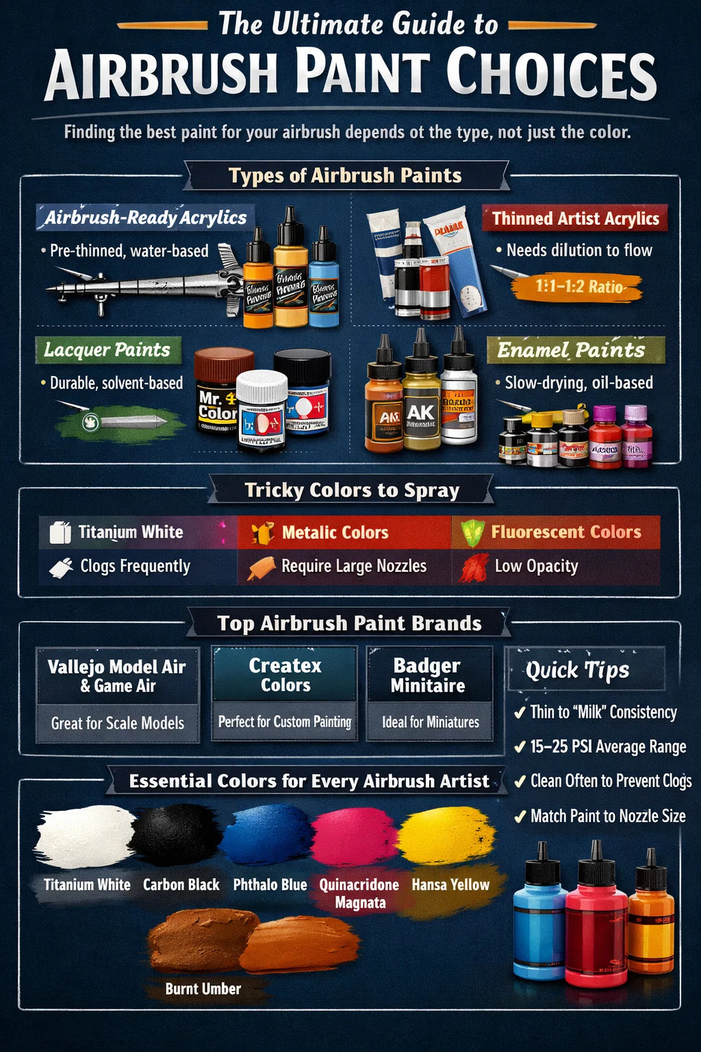 에어브러시에 가장 적합한 색상을 선택하는 것은 궁극적으로 올바른 페인트 시스템을 노즐 크기, 압축기 출력 및 의도한 표면과 결합하는 것입니다. 일반적인 지침:
