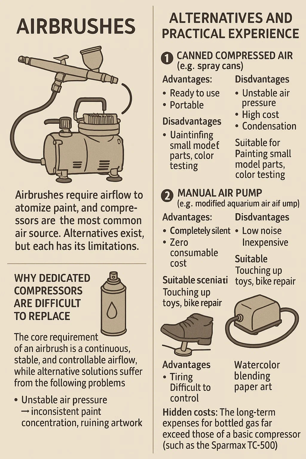 에어브러시 페인트를 원자화하려면 공기 흐름이 필요하며 압축기가 가장 일반적인 공기 공급원입니다. 대안이 존재하지만 각각에는 한계가 있습니다.