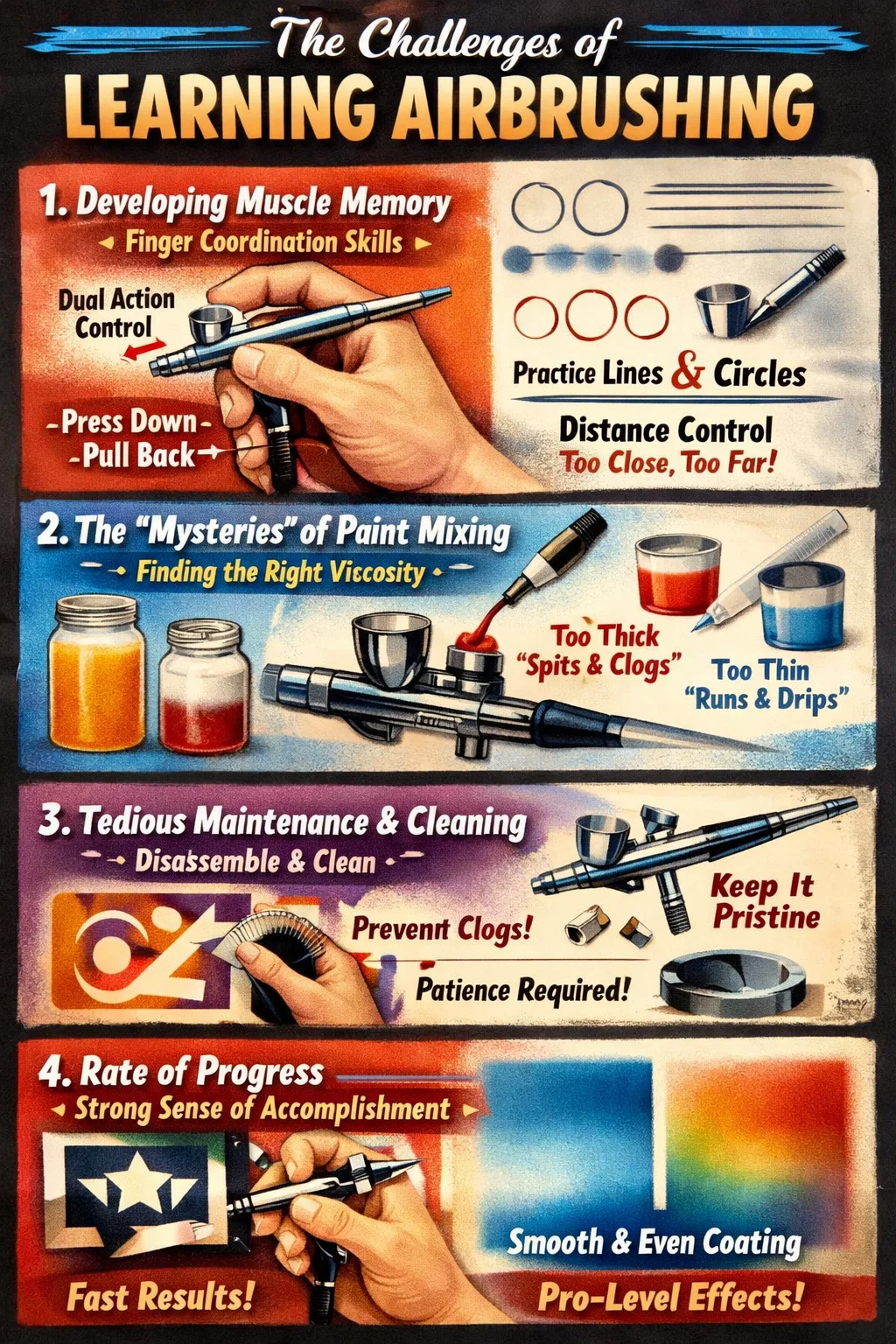 에어브러싱 학습의 어려움에 관한 몇 가지 실용적인 측면은 다음과 같습니다.